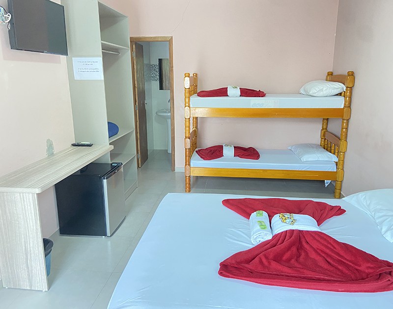 Os quartos família da Pousada Villa Sambaqui foram pensados para oferecer conforto, praticidade e um ambiente acolhedor para quem viaja com crianças ou em grupos. Disponíveis nas versões Casal, tripla, quádrupla e quíntupla, essas acomodações são ideais para quem busca descansar bem após um dia de diversão no Beto Carrero World, que fica a poucos metros da pousada.